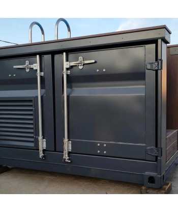 Moderne Containerpools verfügen oft über integrierte Technikräume, die hinter den originalen Containertüren oder speziellen GFK-Türen verborgen sind.